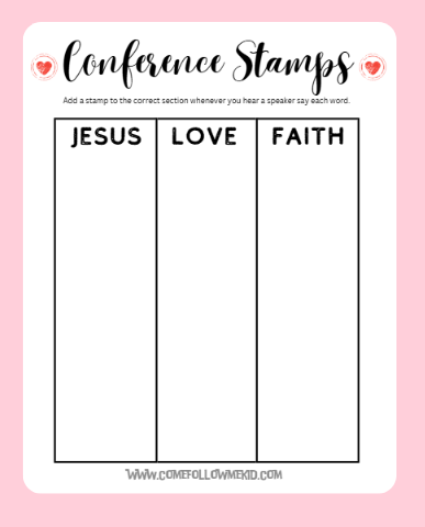 CONFERENCE WORD STAMPS: Have them stamp a picture on a section of paper each time they hear a certain word while listening to conference. You can also use stickers or just have them draw a small heart/smiley face/etc. when they head each word.