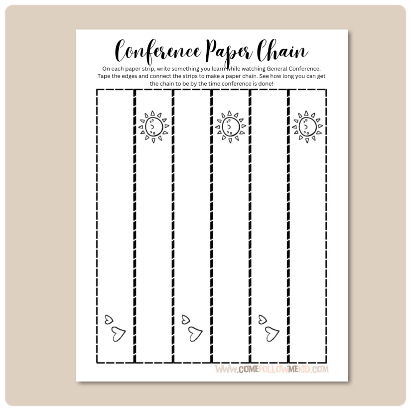 PAPER CHAIN CONFERENCE THOUGHTS: On each paper strip, write something you learn while watching General Conference. Tape the edges and connect the strips to make a paper chain. See how long you can get the chain to be by the time conference is done! Print up the paper strips below or just cut strips out of whatever colored paper you have.